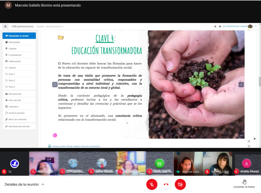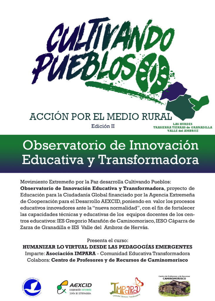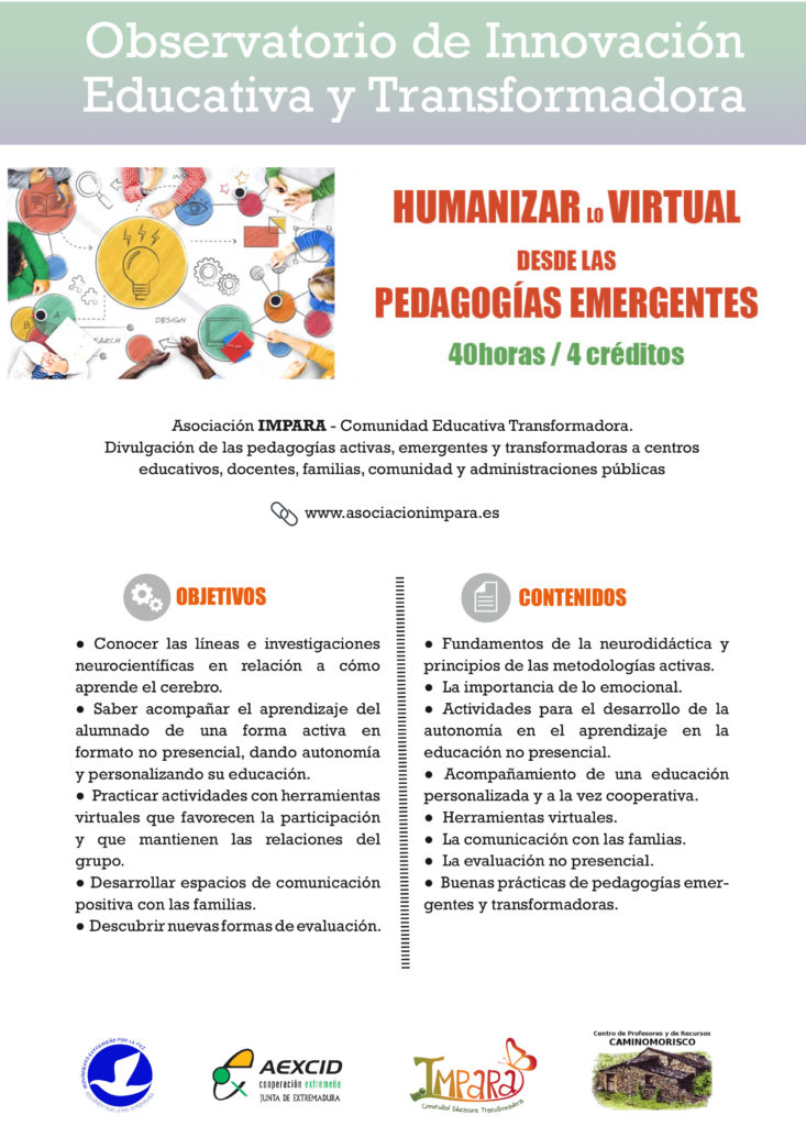 Da comienzo el curso Humanizar lo Virtual desde las Pedagogía Emergentes impartido por Impara: Comunidad Educativa Transformadora a través del CPR de Caminomorisco, este curso está dirigido al profesorado de los centros educativos con los que trabajamos en el norte de Extremadura: IES Gregorio Marañón de Caminomorisco, IESO Cáparra de Zarza de Granadilla y el IES Valle del ambroz de Hervás.