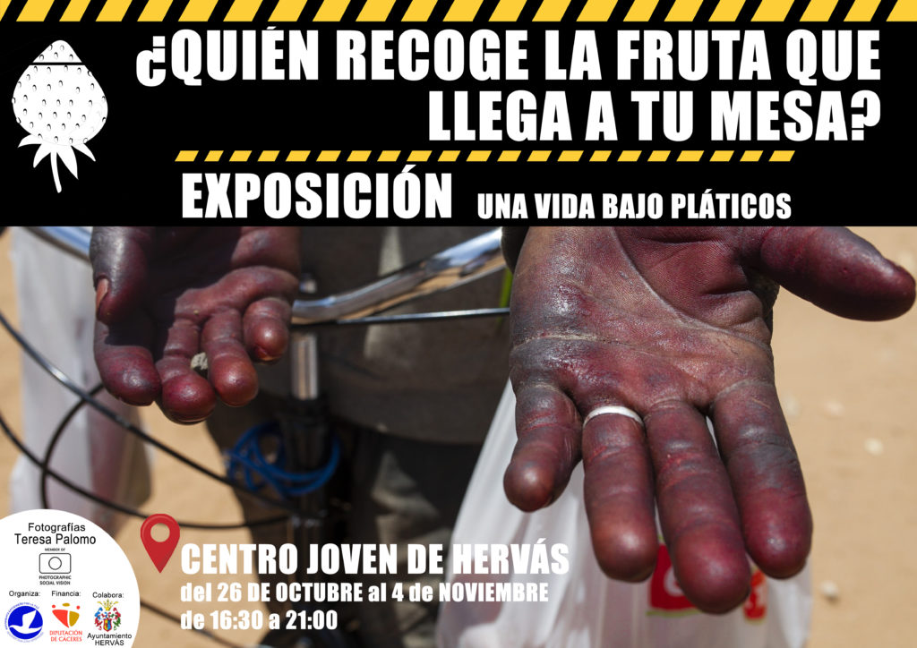 El desarrollo del proyecto consiste en la realización de TALLERES DE SENSIBILIZACIÓN sobre las condiciones de vida de la población migrante que trabaja en la recogida de fruta y verdura en nuestro país y que se ven obligadas a aceptar unas condiciones laborales injustas y en muchos casos, al margen del sistema legal de contratación además de tener que subsistir en asentamientos chabolistas por falta de posibilidades de alquilar viviendas dignas. Estos talleres se desarrollarán en los cuatro colegios que forman parte del CRA Vía de la Plata del Valle del Ambroz (ubicados en las localidades de Segura de Toro, Gargantilla, Aldeanueva del Camino y Baños de Montemayor); en el CEIP Santísimo Cristo de la Salud de Hervás y en el IES Valle del Ambroz de Hervás. Estas acciones se complementarán con la instalación en el Espacio de Creación Joven de Hervás de la EXPOSICIÓN FOTOGRÁFICA (del 26 de Octubre al 4 de Noviembre – Centro Joven de Hervás de 16:30 a 21:00) de la fotoperiodista Teresa Palomo “Una vida bajo plástico”, con imágenes de las condiciones de vida en los asentamientos chabolistas de Huelva y Almería. Además, en el Cine Teatro de Hervás se hará una PROYECCIÓN (5 DE NOVIEMBRE. 20:30h – Cine-Teatro Hervás) del documental “Después de las 8” de la productora Bruna Cooperativa Audiovisual y L’Observatori Desc que “narra, tomando como punto de partida los ataques racistas que tuvieron lugar en el año 2000 en la localidad almeriense de El Ejido, cómo se ha consolidado un sistema de explotación de mano de obra migrante en el campo para exportar la verdura al norte de Europa, generando las mismas tensiones raciales que la extrema derecha ha aprovechado para crecer durante los últimos años”. (Jairo Vargas en Público.es).